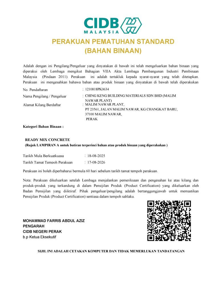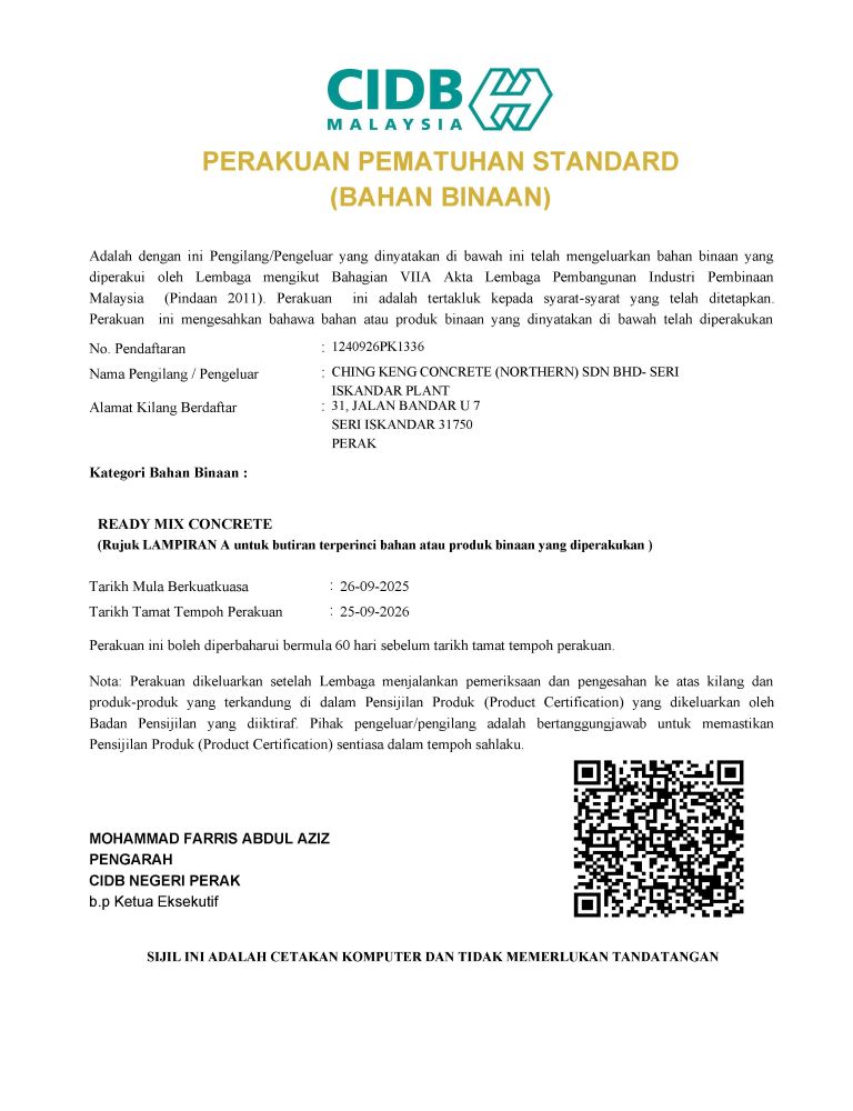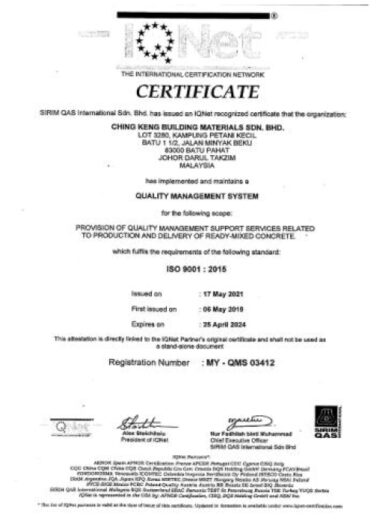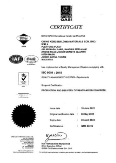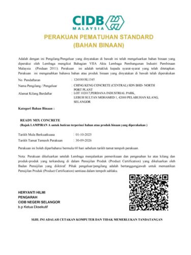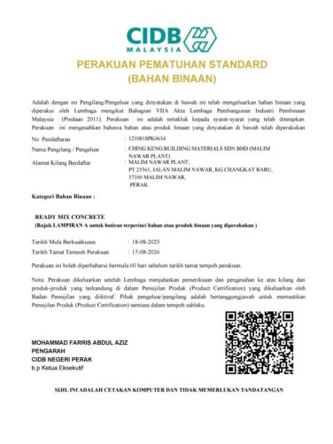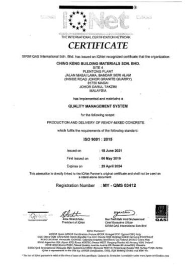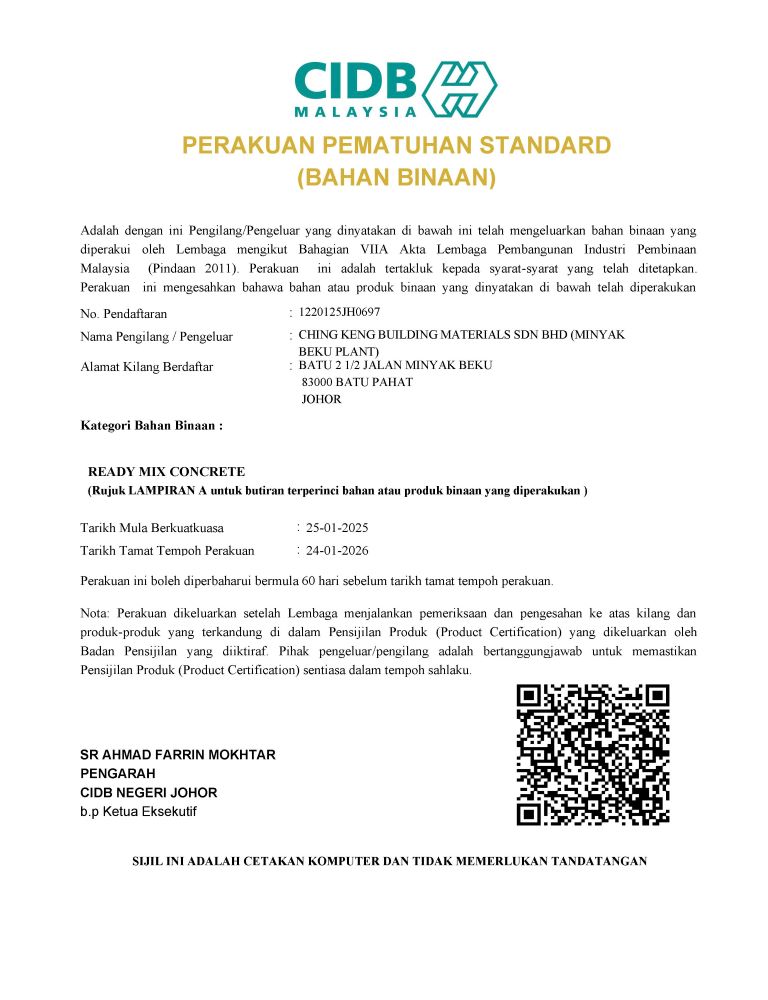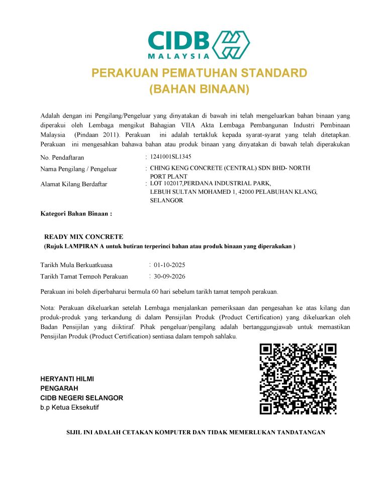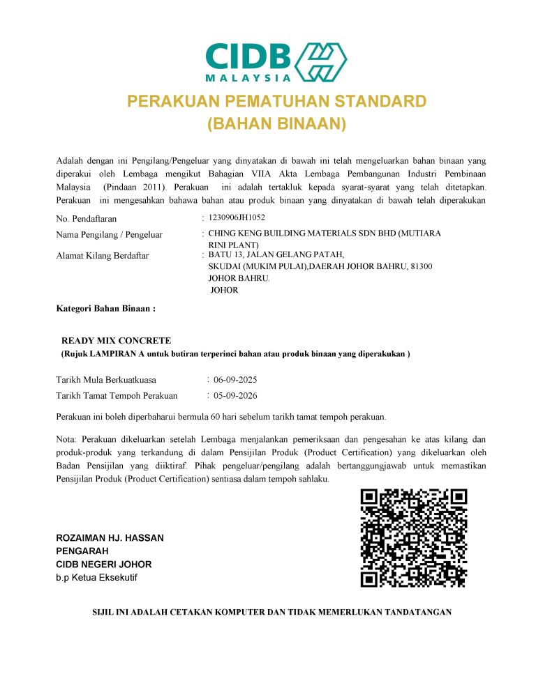 Ching Keng Building Materials Sdn Bhd is family owned and start to operate as ready mixed concrete manufacturer and supplier serving Malaysia construction industries since 1995. Ching Keng continues to conduct business based on the principles responsible for its conception.