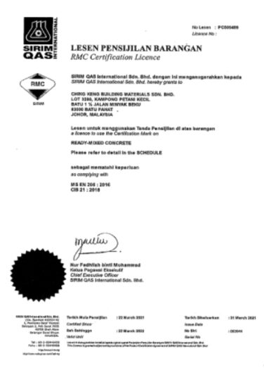Currently CK have 7 batching plants in Malaysia which located at Batu Pahat, Plentong, Layangkasa, Ulu Tiram (Johor), Kampar (Perak), Klang, North Port Klang (Selangor). The company is led by a team of experienced and technically competent management group to spear ahead involvement in building construction.