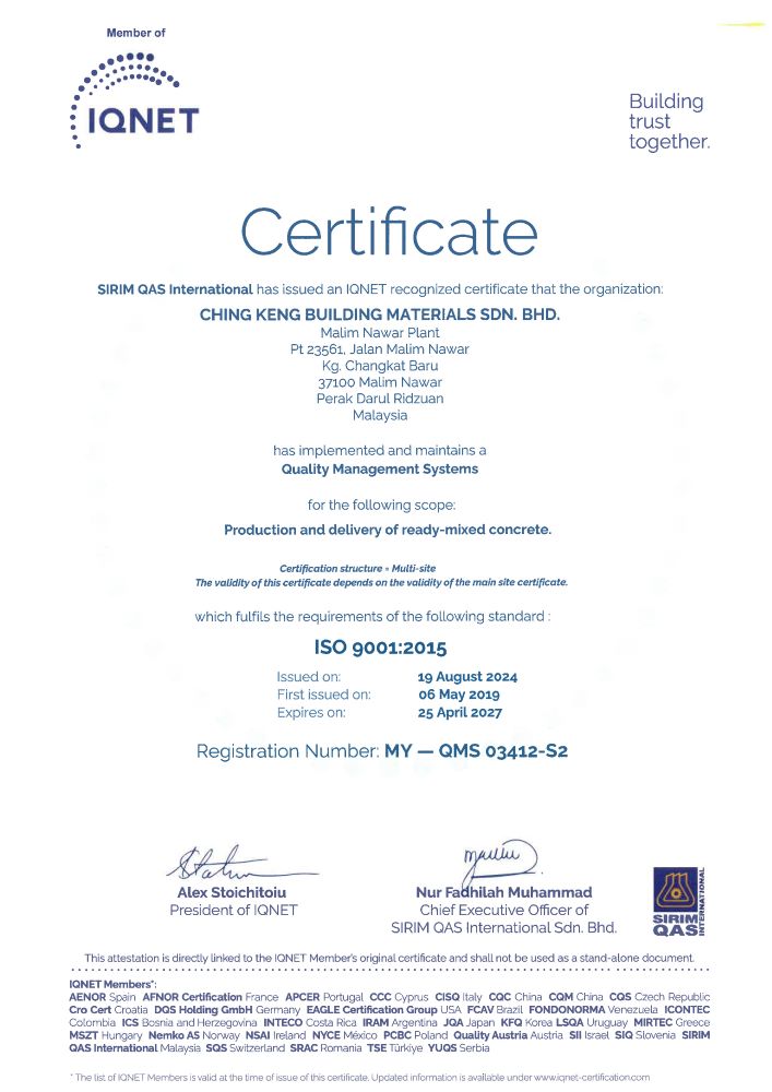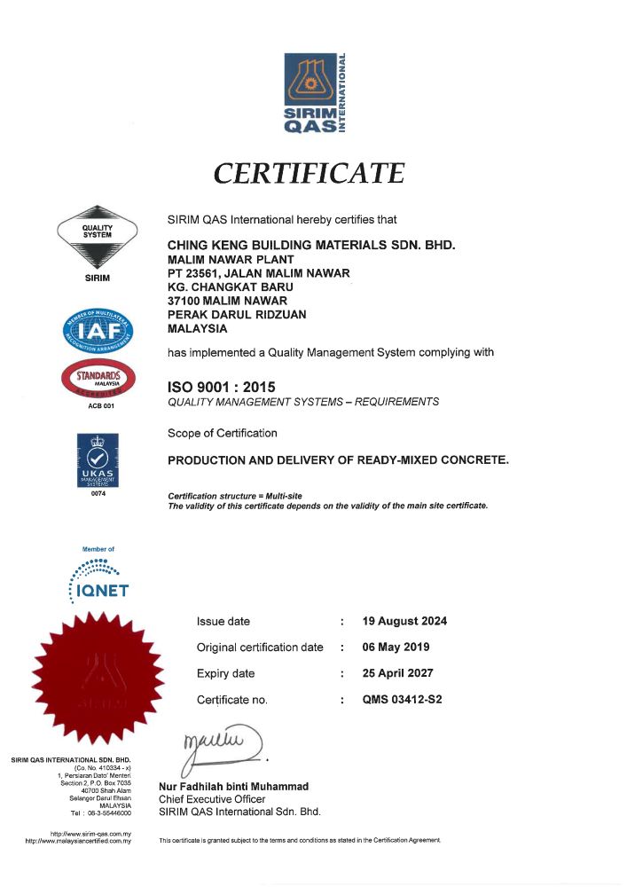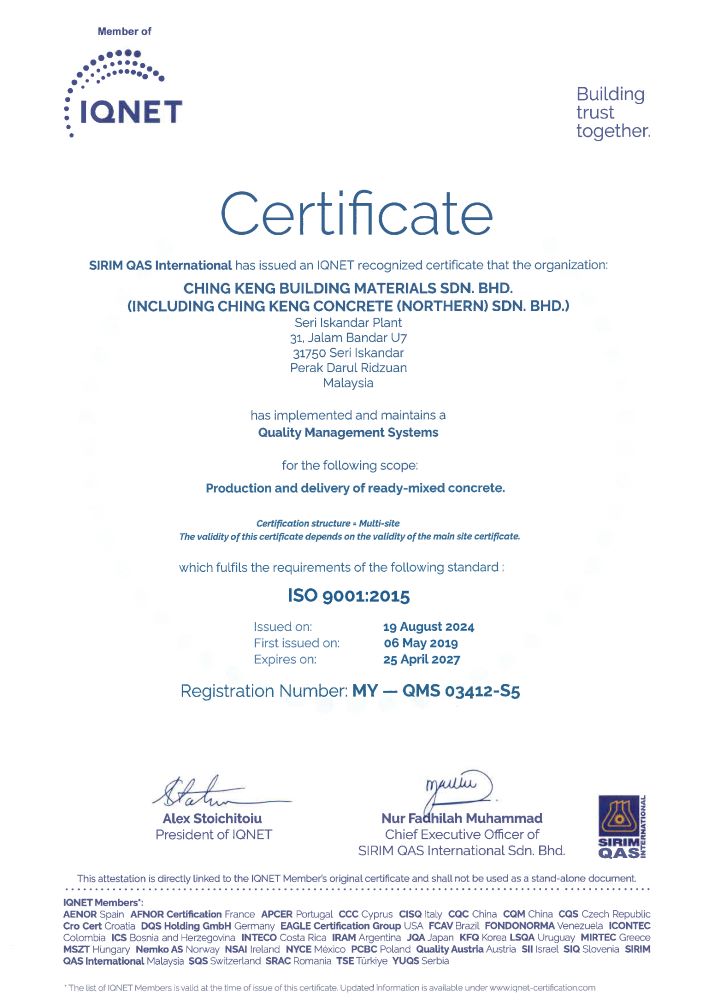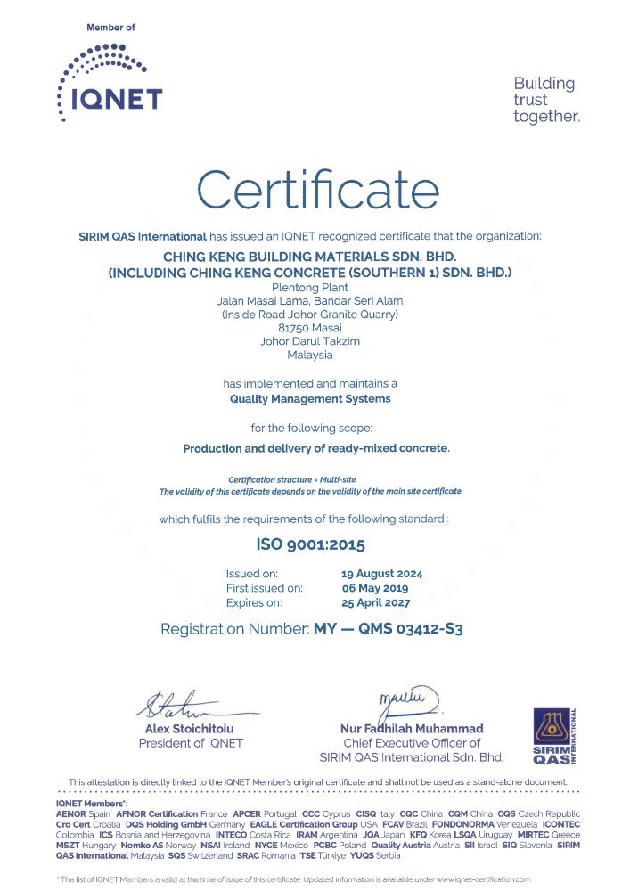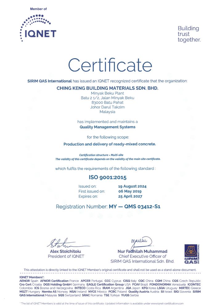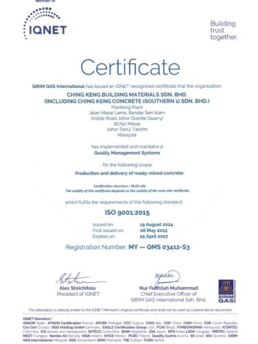 Currently Ching Keng have 15 batching plants across Malaysia, with facilities located in Plentong, Minyak Beku, Mutiara Rini, Tanjung Labuh, Mersing, Ulu Tiram, Tropicana (GP2 Lima Kedai) and Pulai Spring within Johor, Klang and North Port Klang in Selangor, Meru, Seri Iskandar, Sitiawan, and Kampar in Perak, as well as Kuantan in Pahang. The company is led by a team of experienced and technically competent management group to spear ahead involvement in building construction.